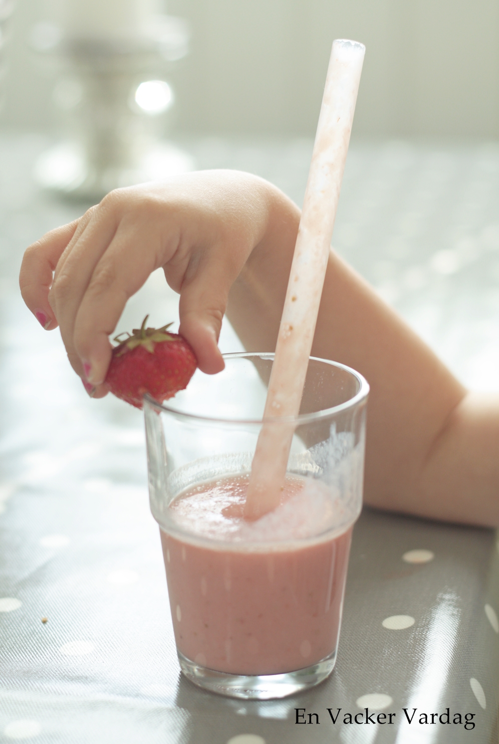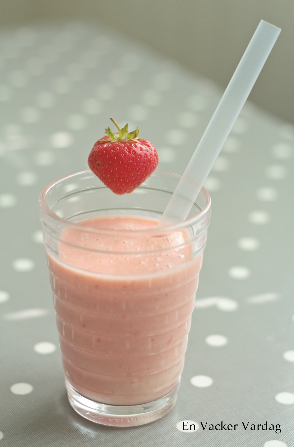 Även om den här sommaren inte erbjudit många möjligheter att äta frukost ute på terrassen, så behöver man ju inte hänga läpp för det. Våra tidigare ganska blygsamma jordgubbsplantor levererar nu tacksamt med bär och visst är det stor skillnad på att göra smoothie på färska bär jämfört med de infrysta man använder på vintern. Att börja dagen med en jordgubbssmoothie är minsann ett gott sätt att börja dagen.